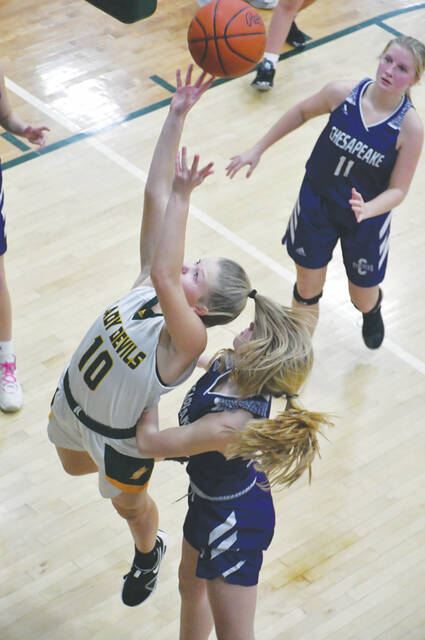 North Adams’ Ainsley Grooms is fouled on her way up to the basket in action from the third quarter of the Lady Devils first-round sectional win over Chesapeake on February 10. (Photo by Mark Carpenter)