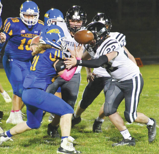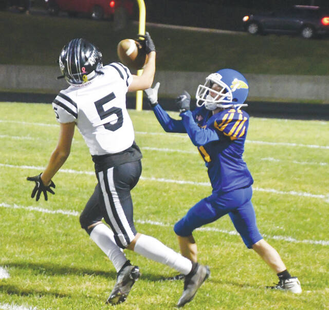 This battle between River Valley receiver Mason Browning (5) and Manchester corner Ronnie Elam resulted in Browning controlling the pass and scoring a touchdown in the match up on October 21 at Veterans Stadium. (Photo by Mark Carpenter)