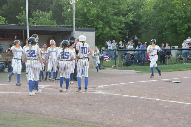 With her teammates waiting at home plate, Manchester’s Rylie Young heads for home plate after blasting a three-run homer in the fourth inning of the Lady Hounds’ district semifinal loss to Reedsville Eastern. (Photo by Mark Carpenter)