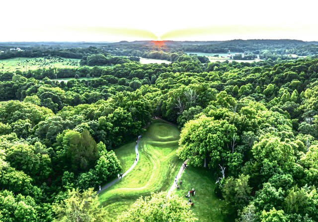 Serpent Mound can bee seen from the air with the sun setting on the horizon during the Summer Solstice on June 21. (Photo by DRONE OHIO)
