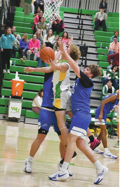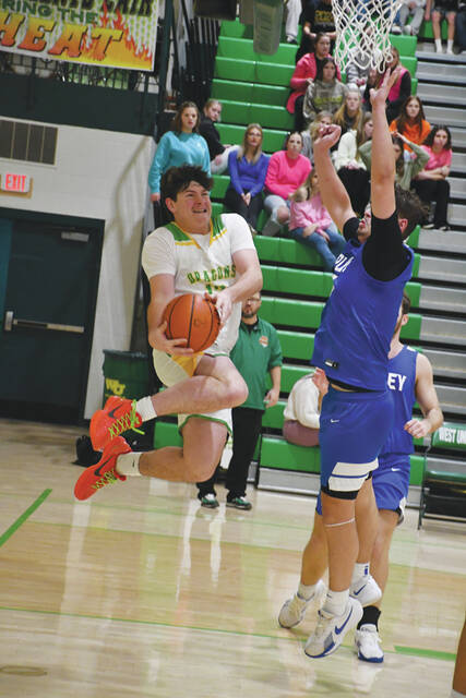 Thomas Barnhart provided a huge first half boost for the West Union Dragons as they defeated the Ripley Blue Jays 56-52. Barnhart scored 12 for the winners, 8 of those in the second quarter. (Photo by Mark Carpenter)