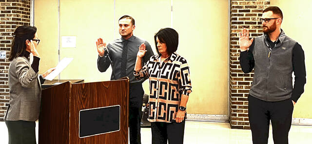 Trent Arey (middle left), Paula McIntosh (right middle) and Ben Hilderbrand (right) are sworn in a new ACOVSD Board members by Treasurer Sherri Spencer (left) on January 5, 2026 at the beginning of the board’s organizational meeting. (Photo courtesy of Dawn Wallace)