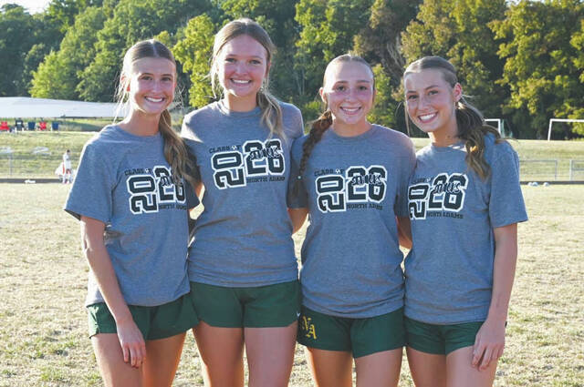 The district semifinal loss to Lynchburg was the final high school soccer game for a quartet of North Adams seniors. From left, Julia Wagner, Emmy Holt, Carlee Garrison and Kensley Cornette. (Photo by Tim Daulton)