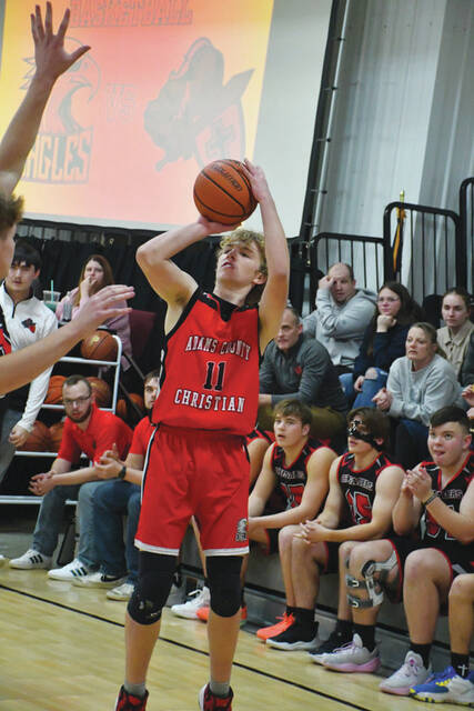 In action from the Southern Ohio Christian Conference on January 23, the Adams County Christian Eagles narrowly defeated the Hillsboro Christian Crusaders 42-40. Pictured at the left is ACCS senior Jed Shivener who led the Eagles with 23 points and also recently scored his 1,000th career point. In the center is Gage Wilson (22) going up for a shot attempt in game where he became the Eagles’ all-time leader in assists. At the right, Adams County Christian’s Josiah Kennedy fires off a three-pointer in the second half of the win over Hillsboro Christian. The Eagles now stand 4-3 in conference play. (Photos by Mark Carpenter)